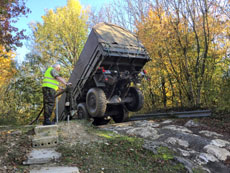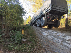 Gut gestärkt stand am Nachmittag für alle Teilnehmer das Befahren der Geländepiste auf dem «Chleihölzli» auf dem Programm. Was zu Fuss auf der Begehung stellenweise mühsam zu laufen war, sollen wir nun mit Lastwagen befahren, welche 12 Tonnen Leergewicht auf die Waage bringen.