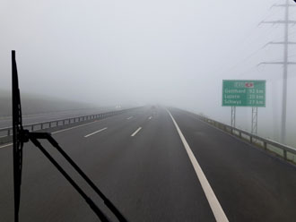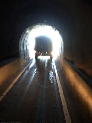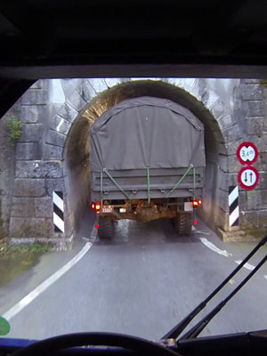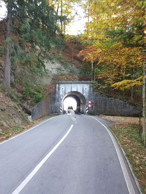 Bis hierhin verlief die Fahrt auf grösstenteils gut ausgebauten Strassen durch verschiedene grössere und kleinere Dörfer. Nach Huttwil tauchten wir in das Emmental ein. Die Strassen wurden schmaler, die Landschaft reizvoller. Nach einigen Kurven durch herbstliche Wälder erreichten wir die Passhöhe Fritzenfluh, wo uns ein kleiner Tunnel erwartete, für dessen Bau anscheinend eines unserer Autos Modell stand.